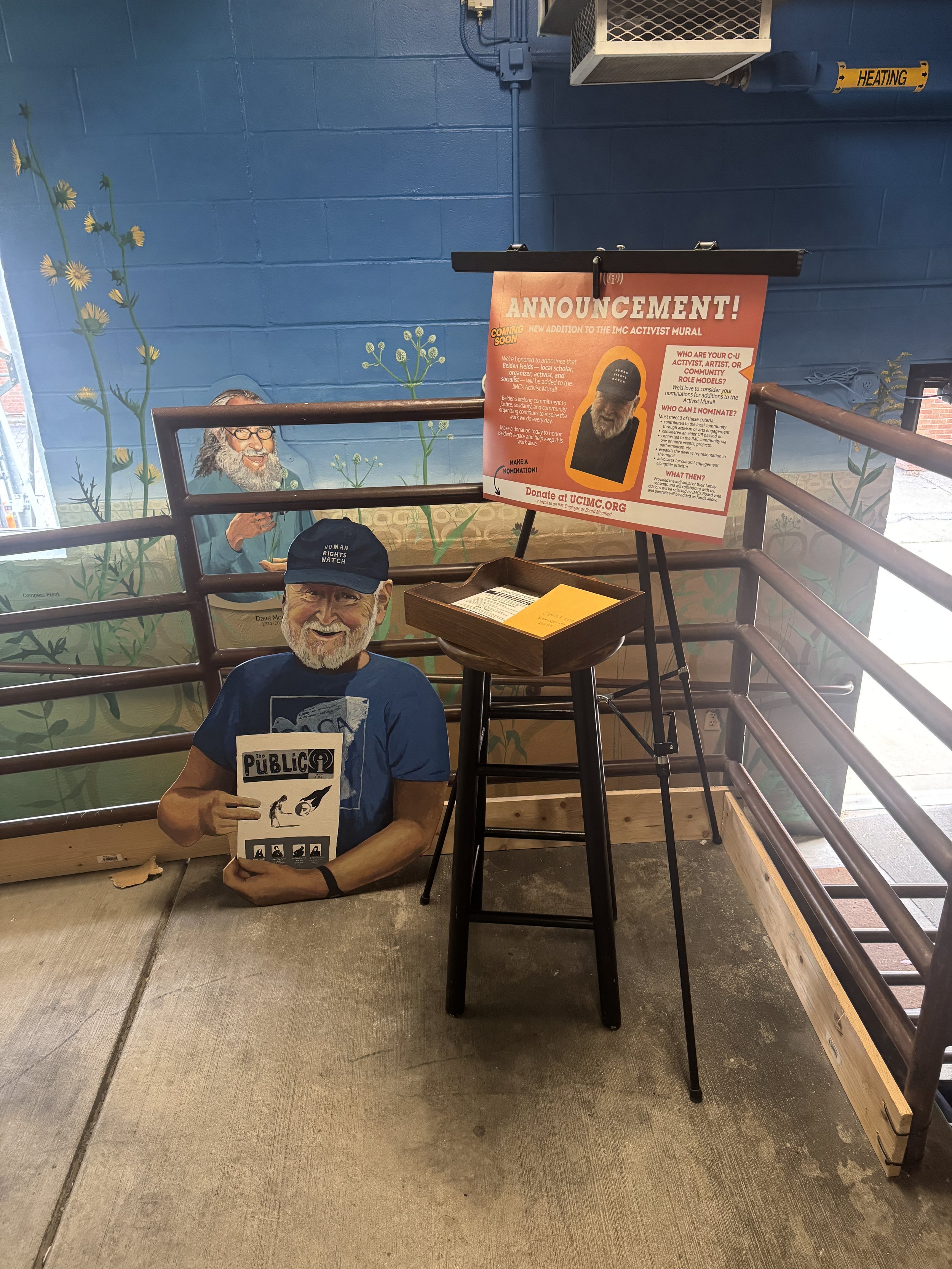 Images below highlight a 2025 portrait addition to the 2024 activist mural, painted at the Independent Media Center in Urbana Illinois. This mural features local activists and native prairie plants and animals. For more information visit www.ucimc.org/activist-mural.